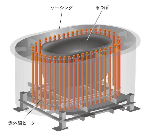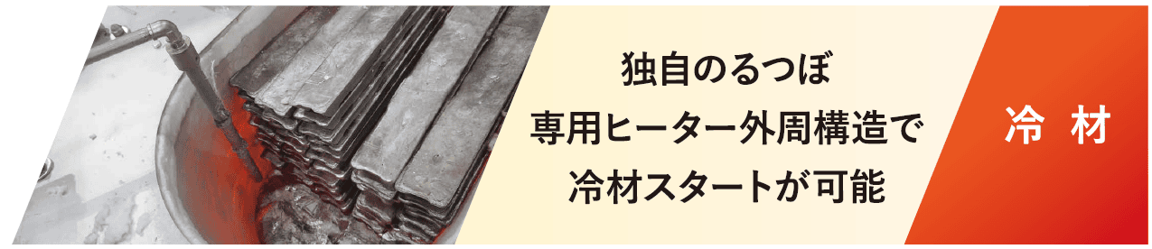 専用ヒーターをるつぼの外周に配置し、ダイレクトに赤外線で加熱するため、溶湯の有無に影響されず、冷材からの溶解スタートが可能となり、種湯の供給も必要ありません。