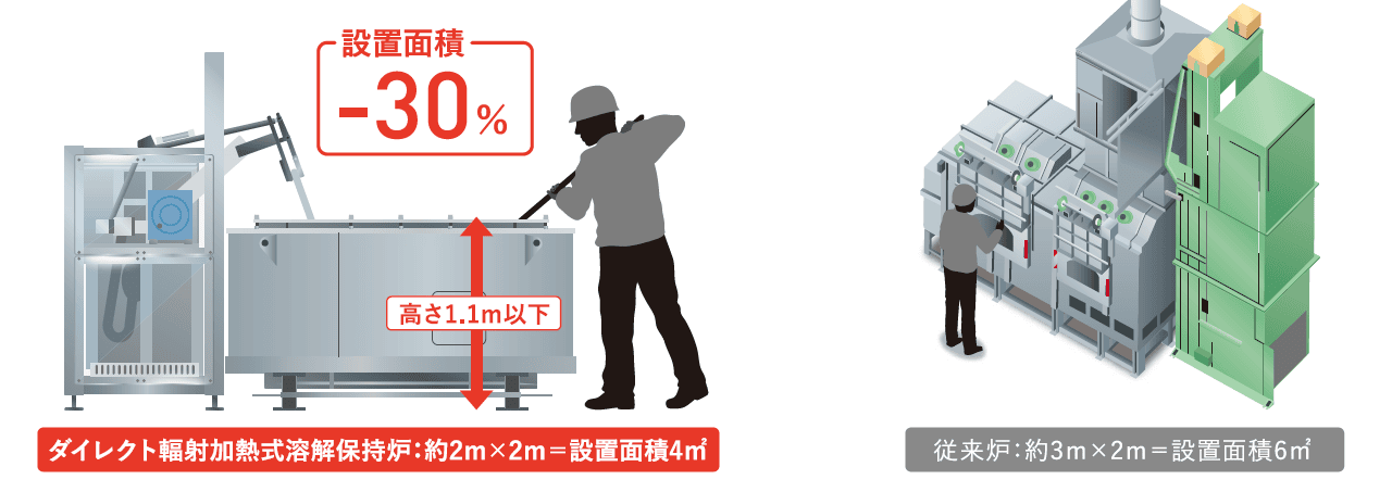 また、設置場所の制約が減り、溶湯の確認や日常のメンテナンスが目線以下のフロア上で行えるため、すべての作業が安全確実で楽になります。
